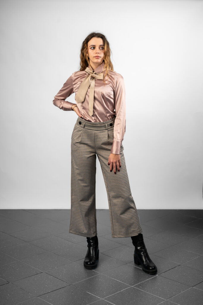 - Na spotkanie: Niezależnie, czy to spotkanie biznesowe, czy lunch z przyjaciółką, ten duet sprawdzi się świetnie. Krata spodni dodaje odrobiny luzu, a satynowy połysk koszuli – odrobiny formalności. Wystarczy delikatna biżuteria (np. złoty naszyjnik) i ulubiona torebka, by stworzyć look idealny na okazje pół-formalne.