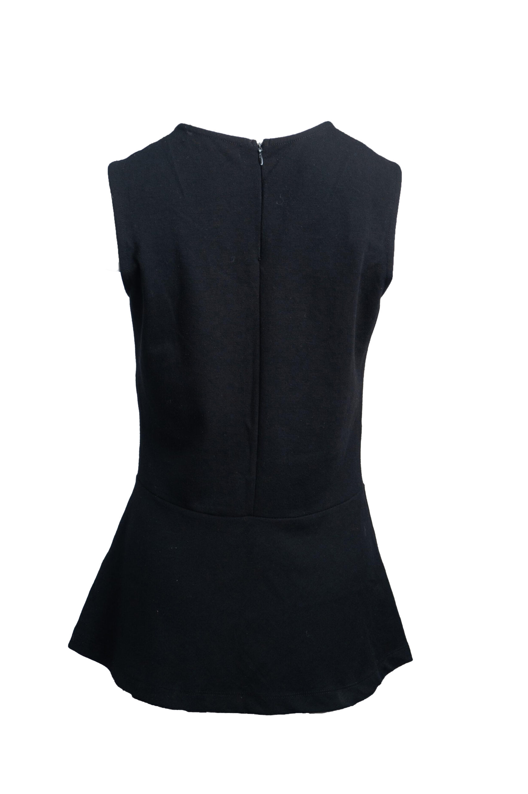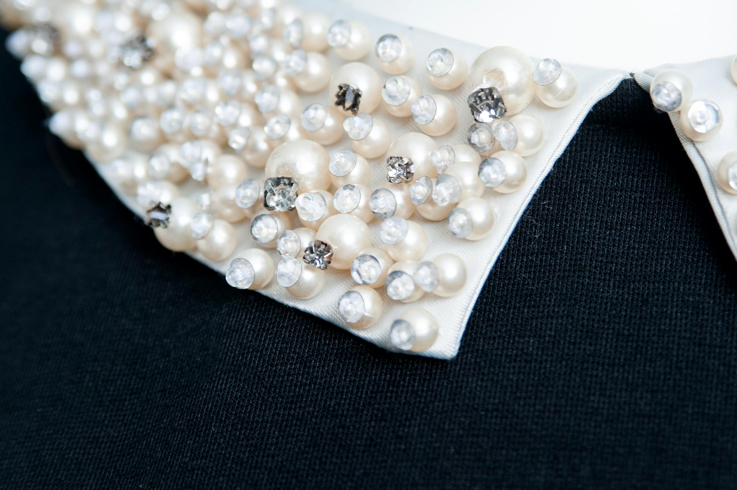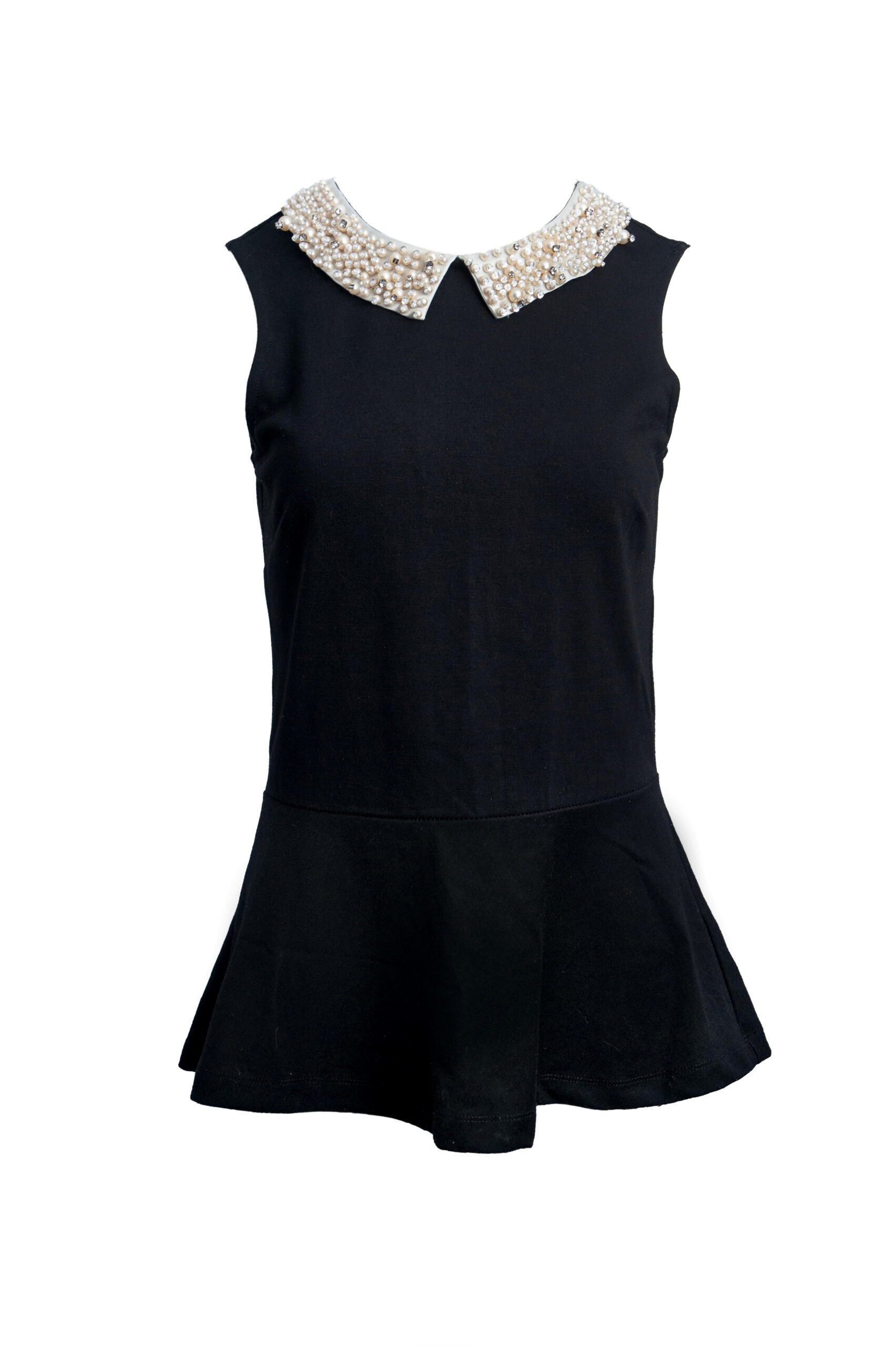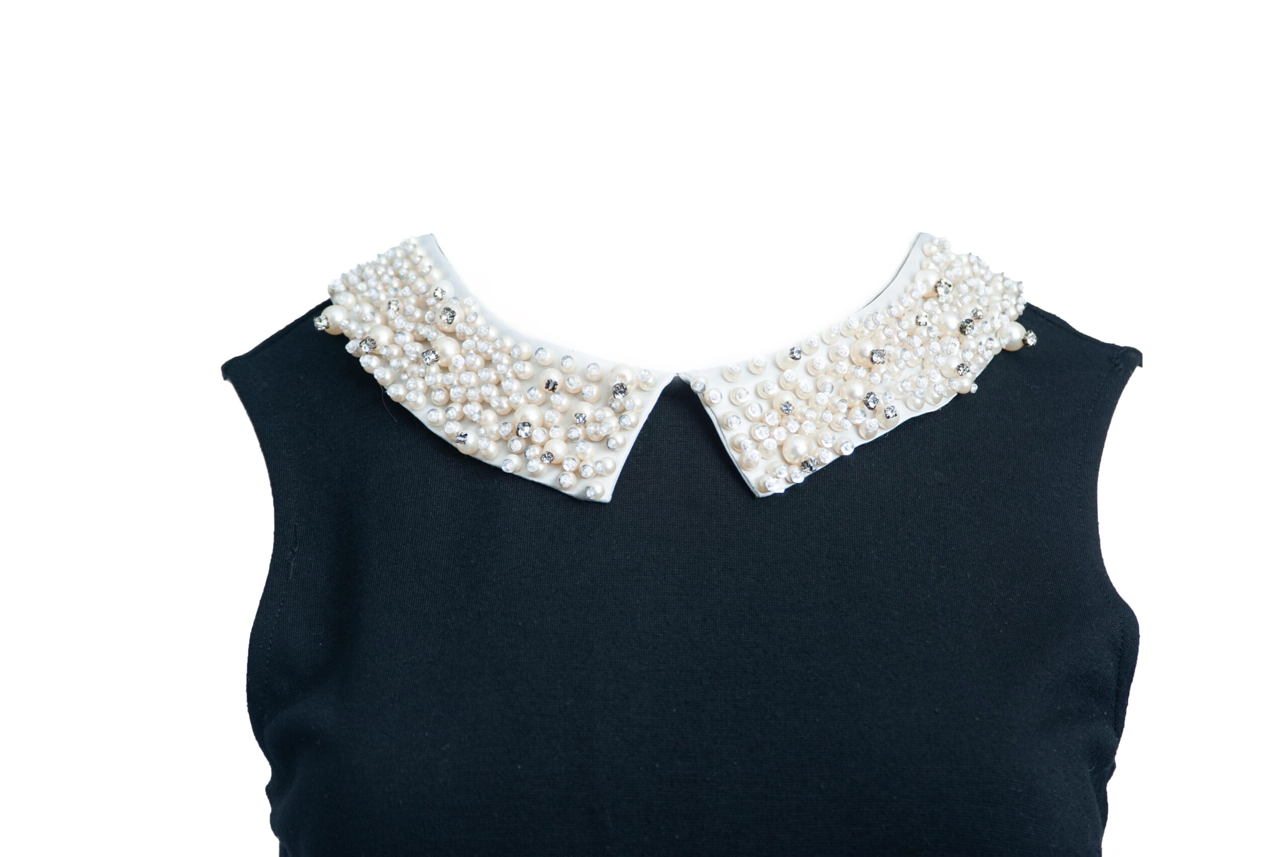 Bluzka taliowana w stylu chanel bez rękawów z ozdobnym białym kołnierzem z perłami i rozszerzanym dołem.