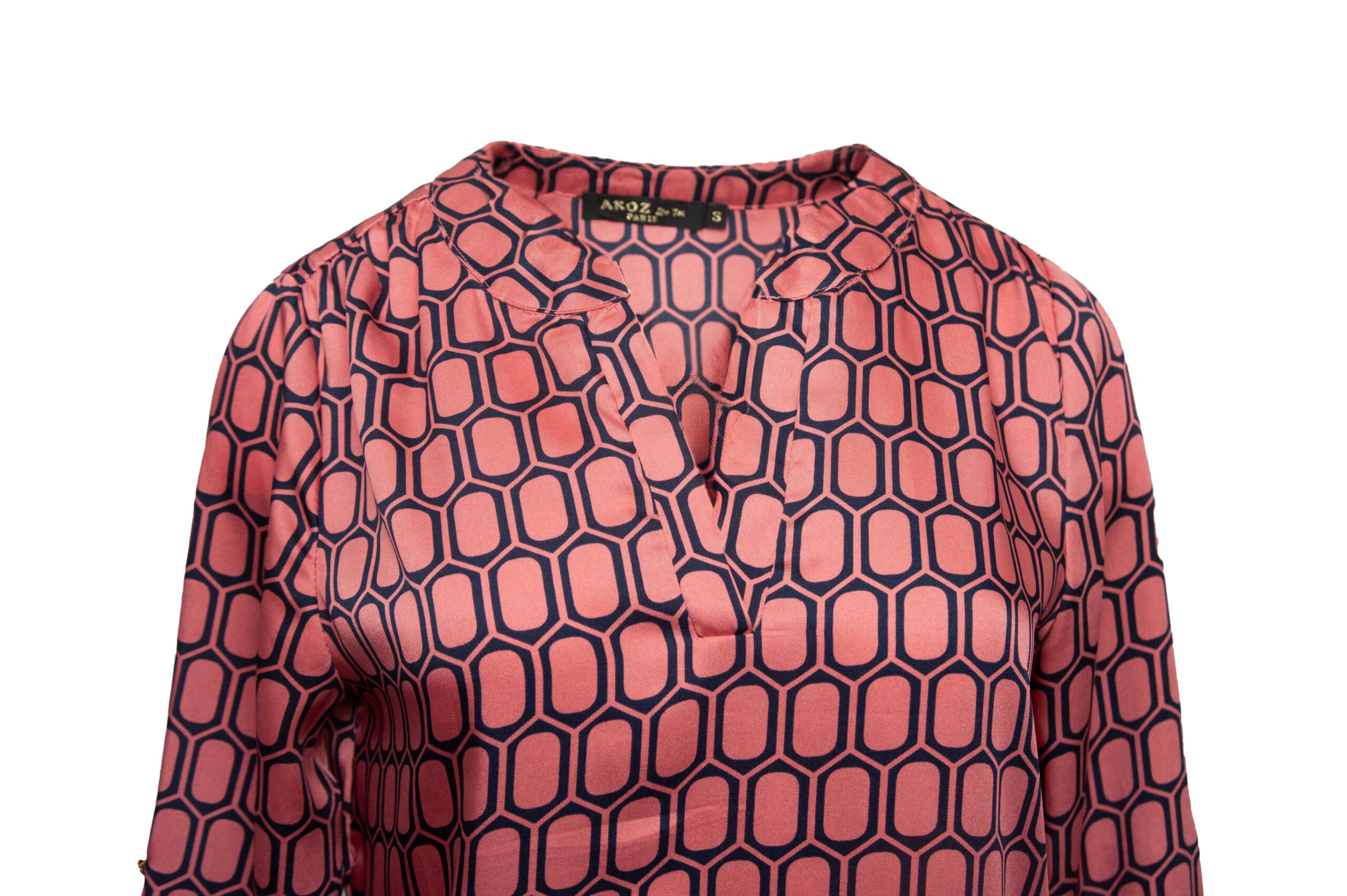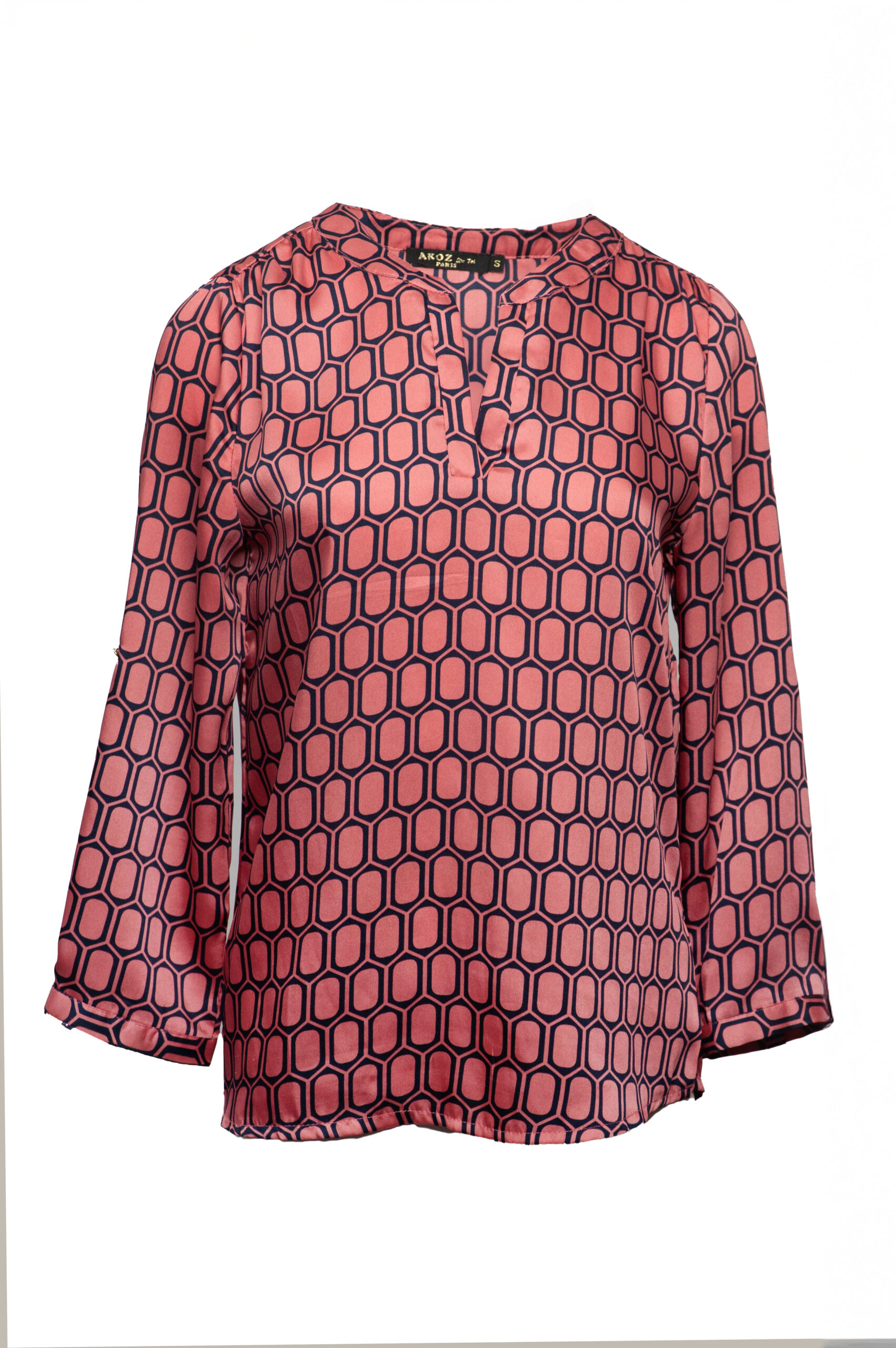 Koszula o szerszym kroju z długim rękawem oraz dekoltem w literkę V. Koszula w kolorze granatowo- różowym w geometryczny wzór.