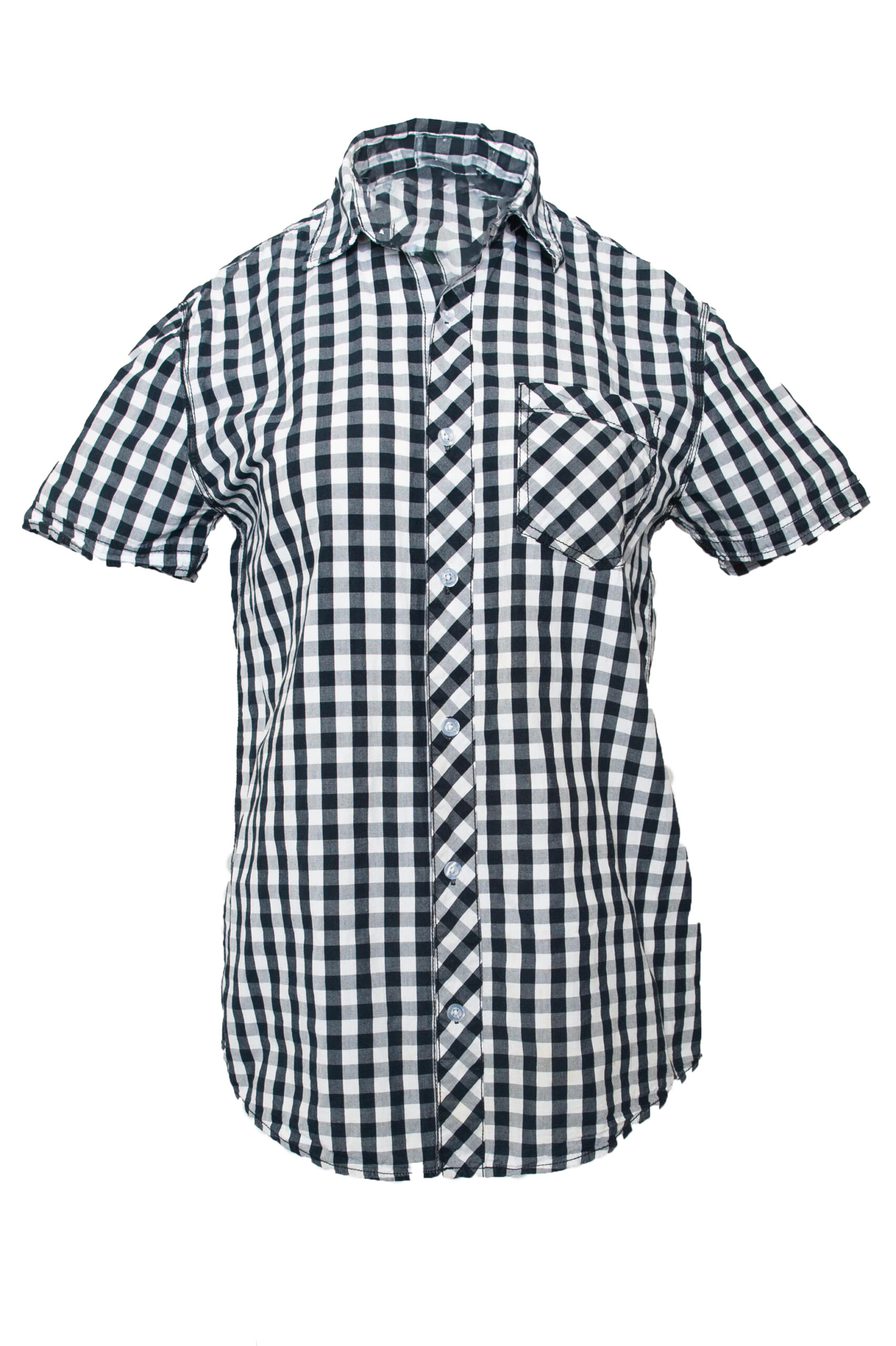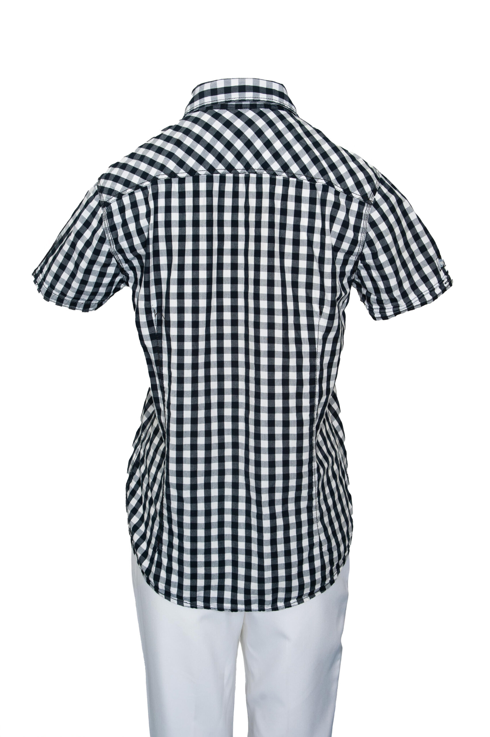 Koszula taliowana z krótkim rękawem w biało-czarna kratkę.
