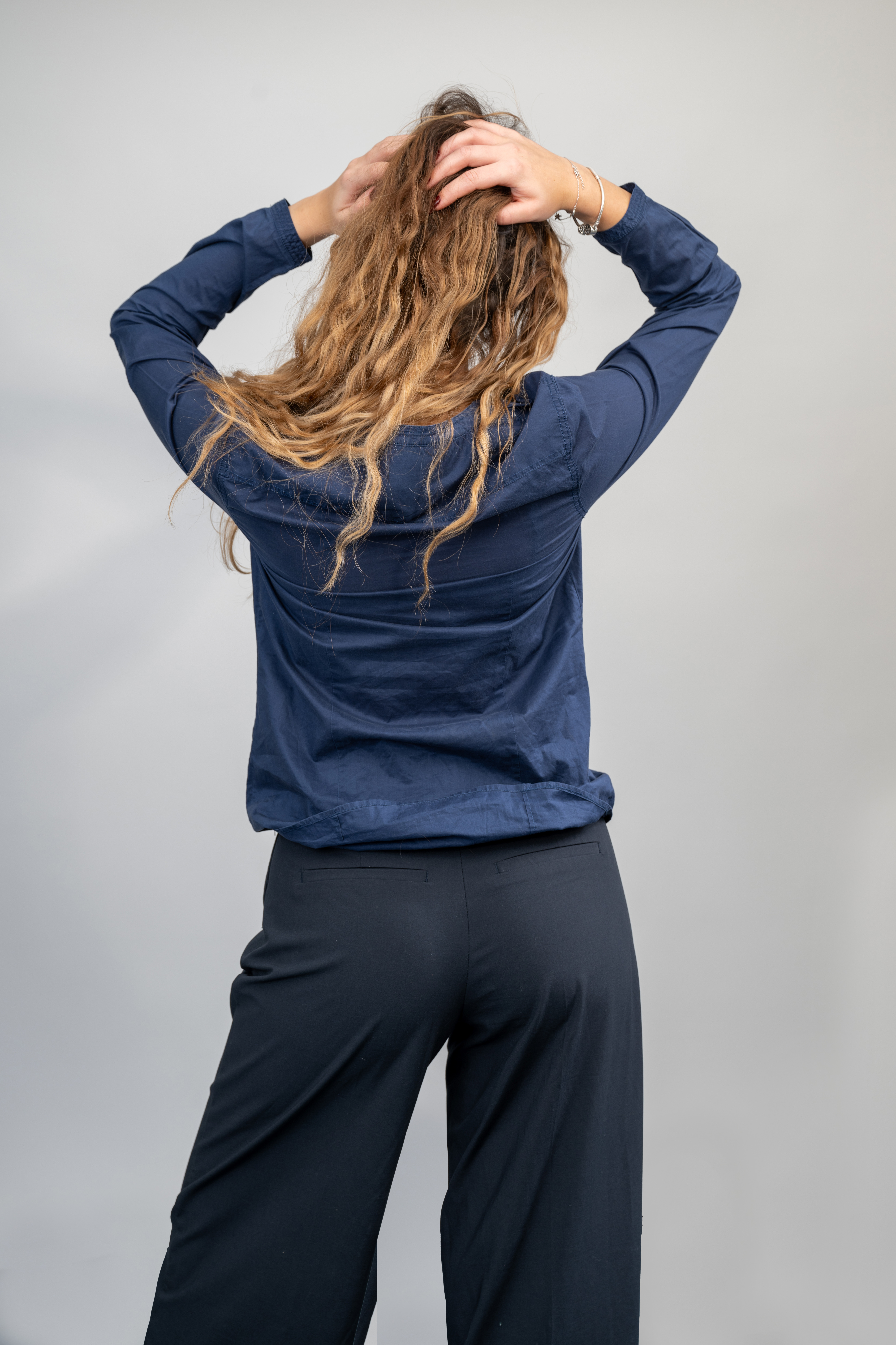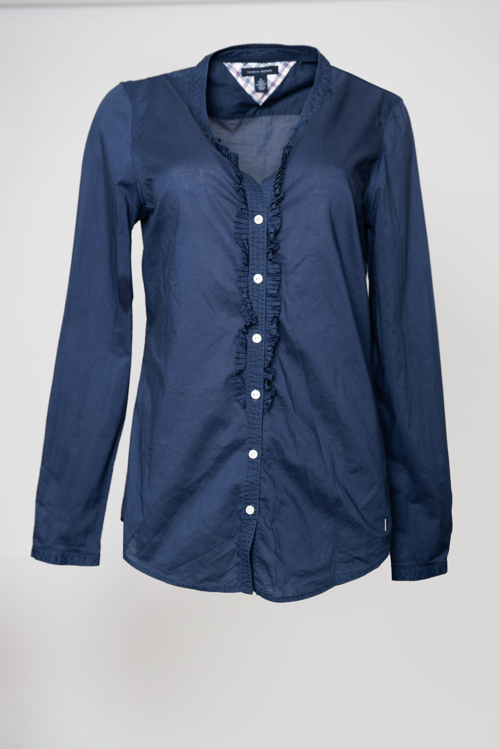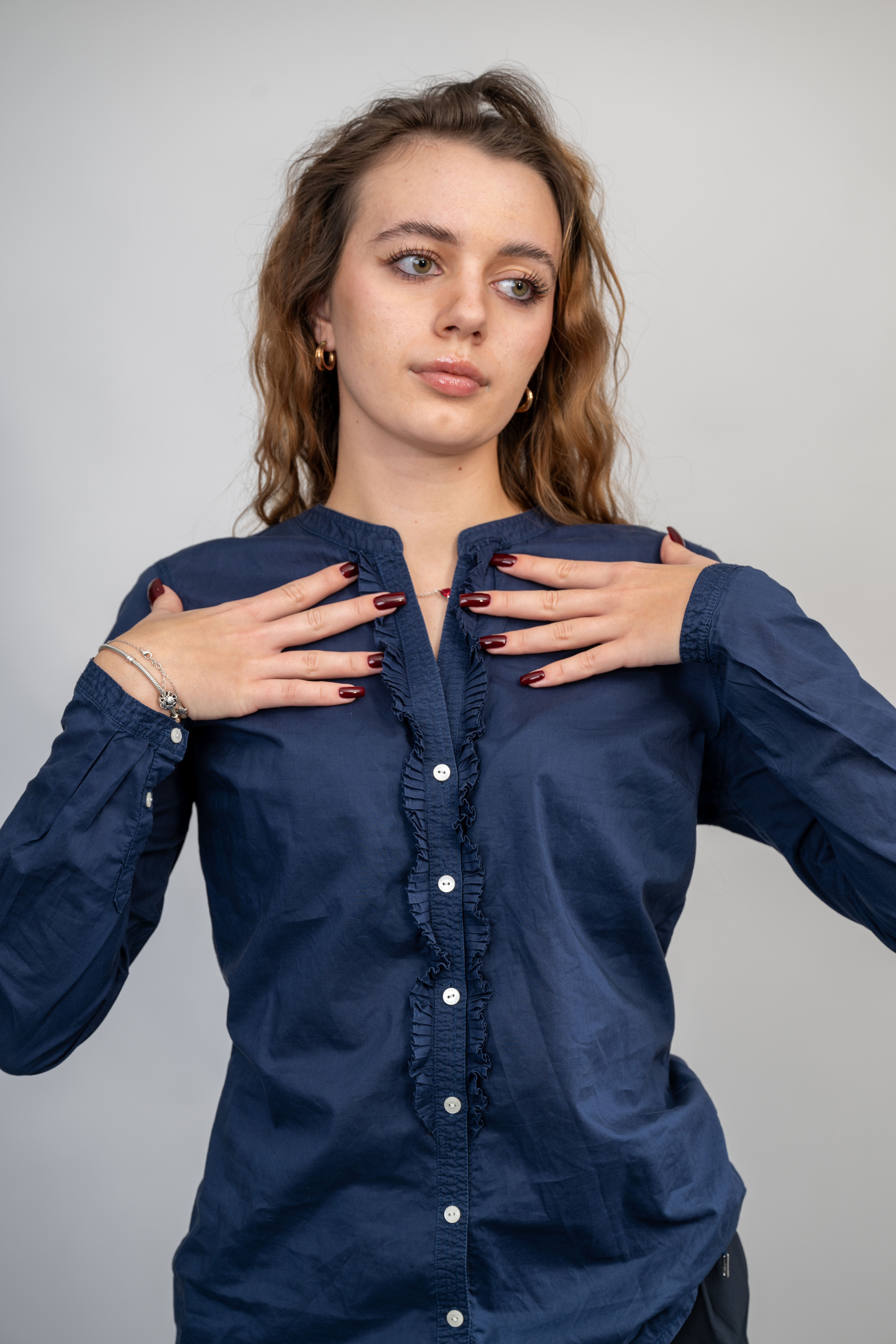 Koszula taliowana z długim rękawem oraz  dekoltem w literkę V, mająca ozdobną falbanką przy guzikach w kolorze granatowym.