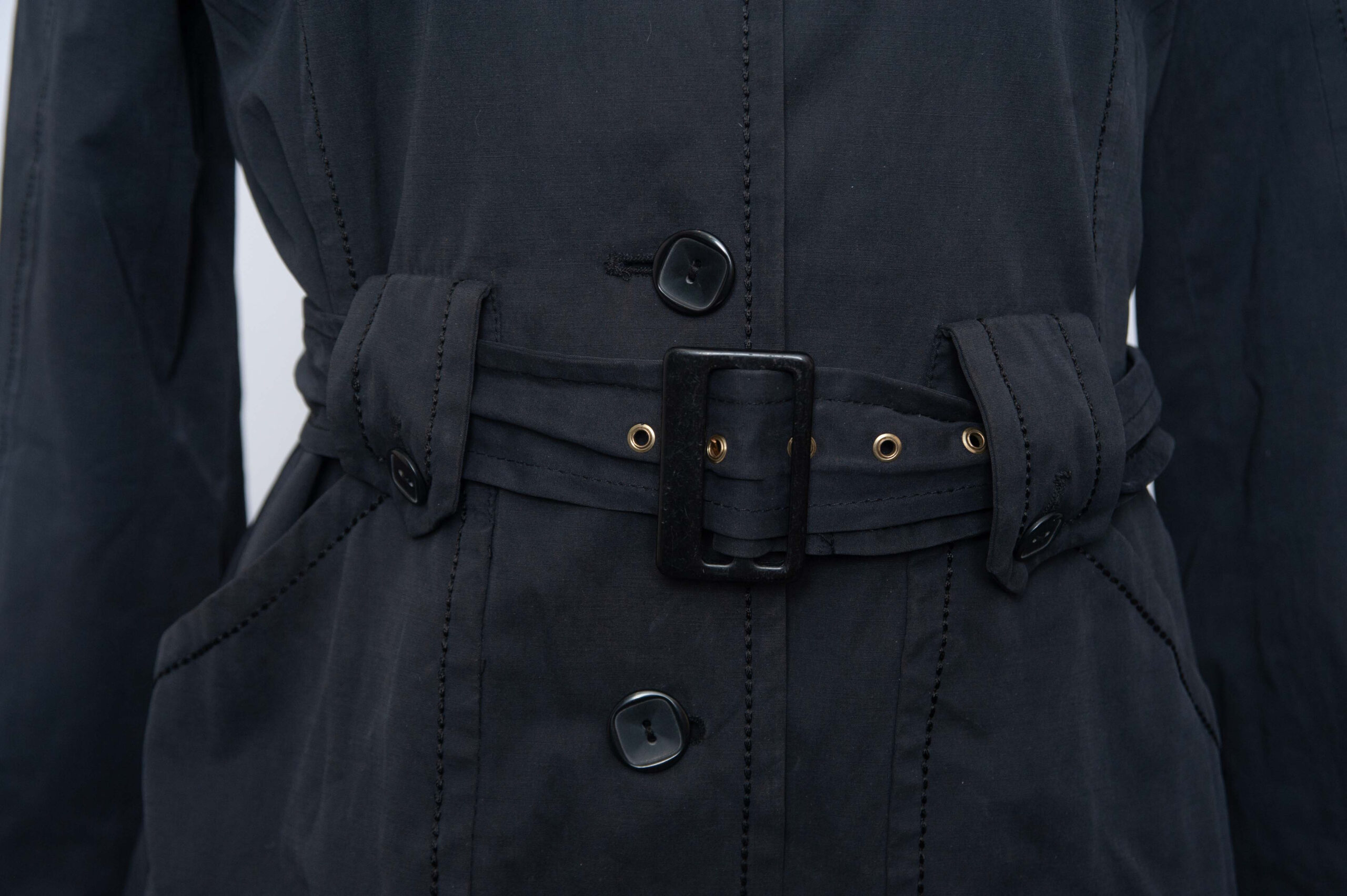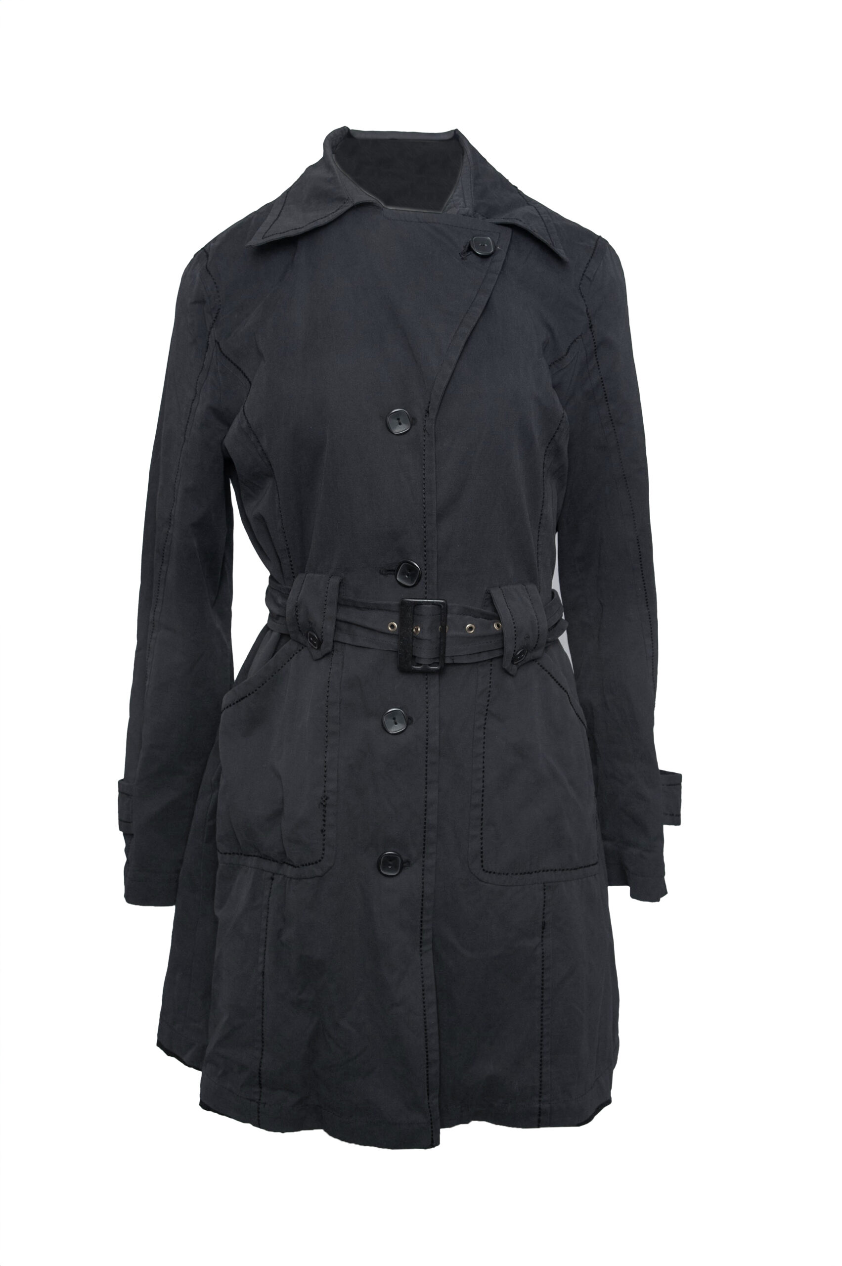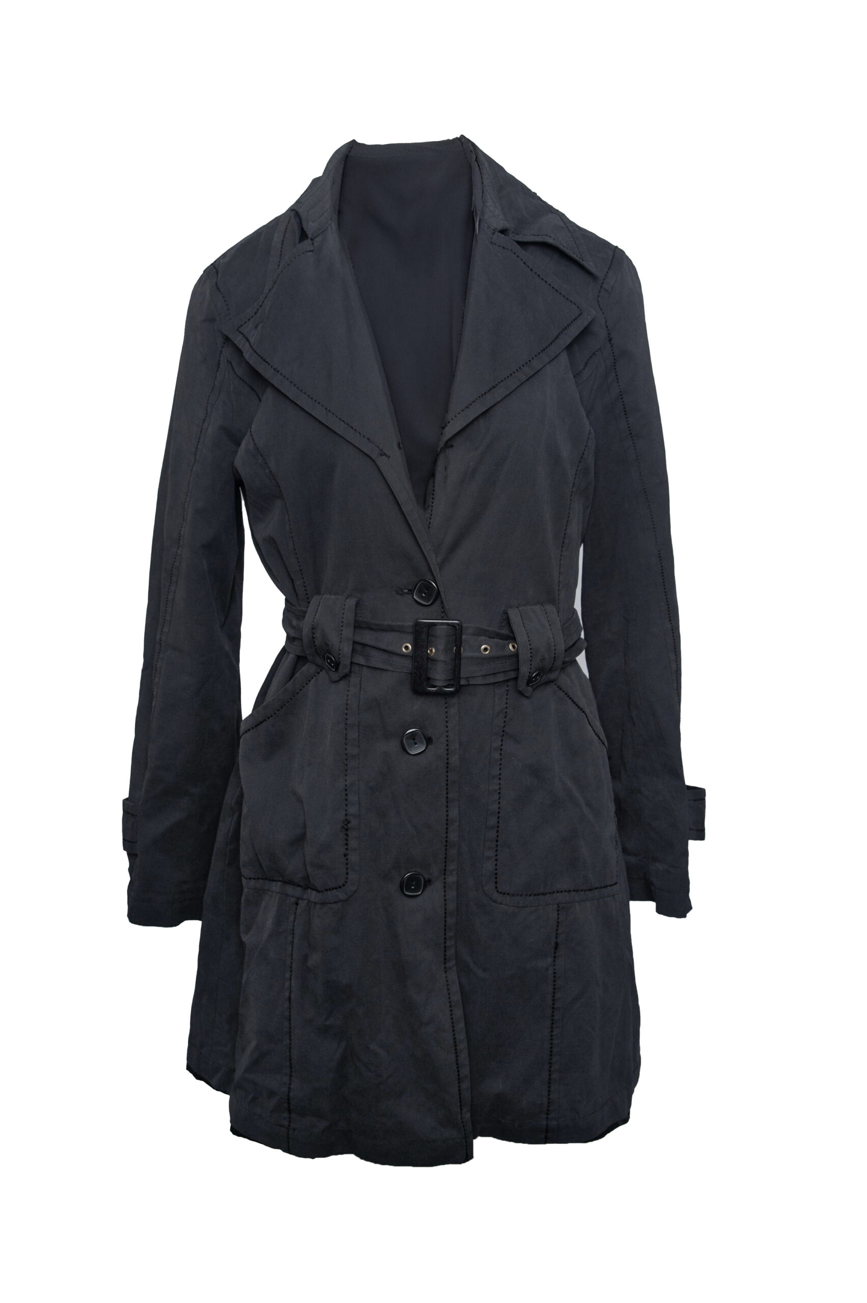 Wiosenny płaszcz w kolorze czarnym do połowy uda wiązany w tali.