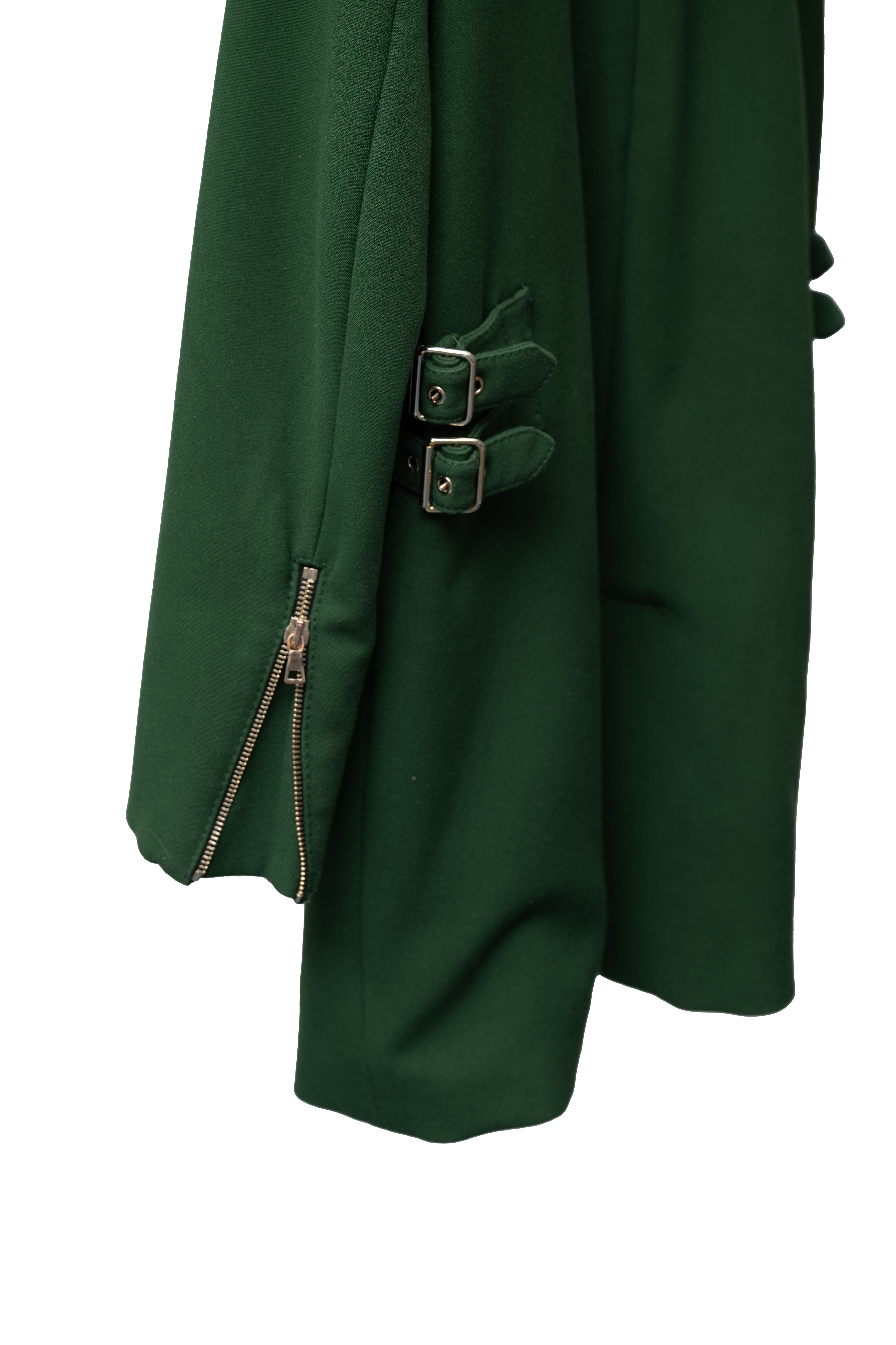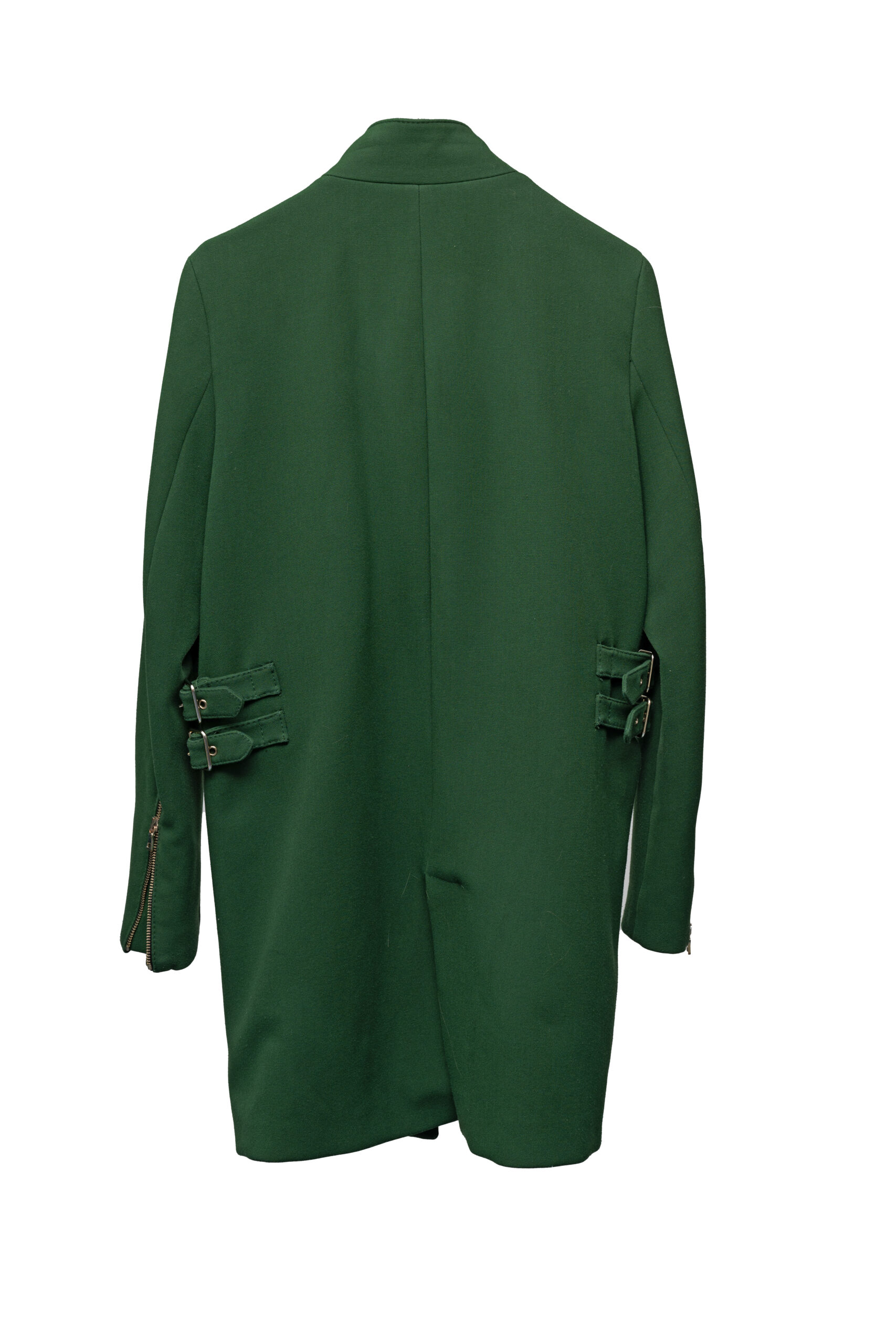 Płaszcz do kolan dwurzędowy w kolorze ciemno zielonym.