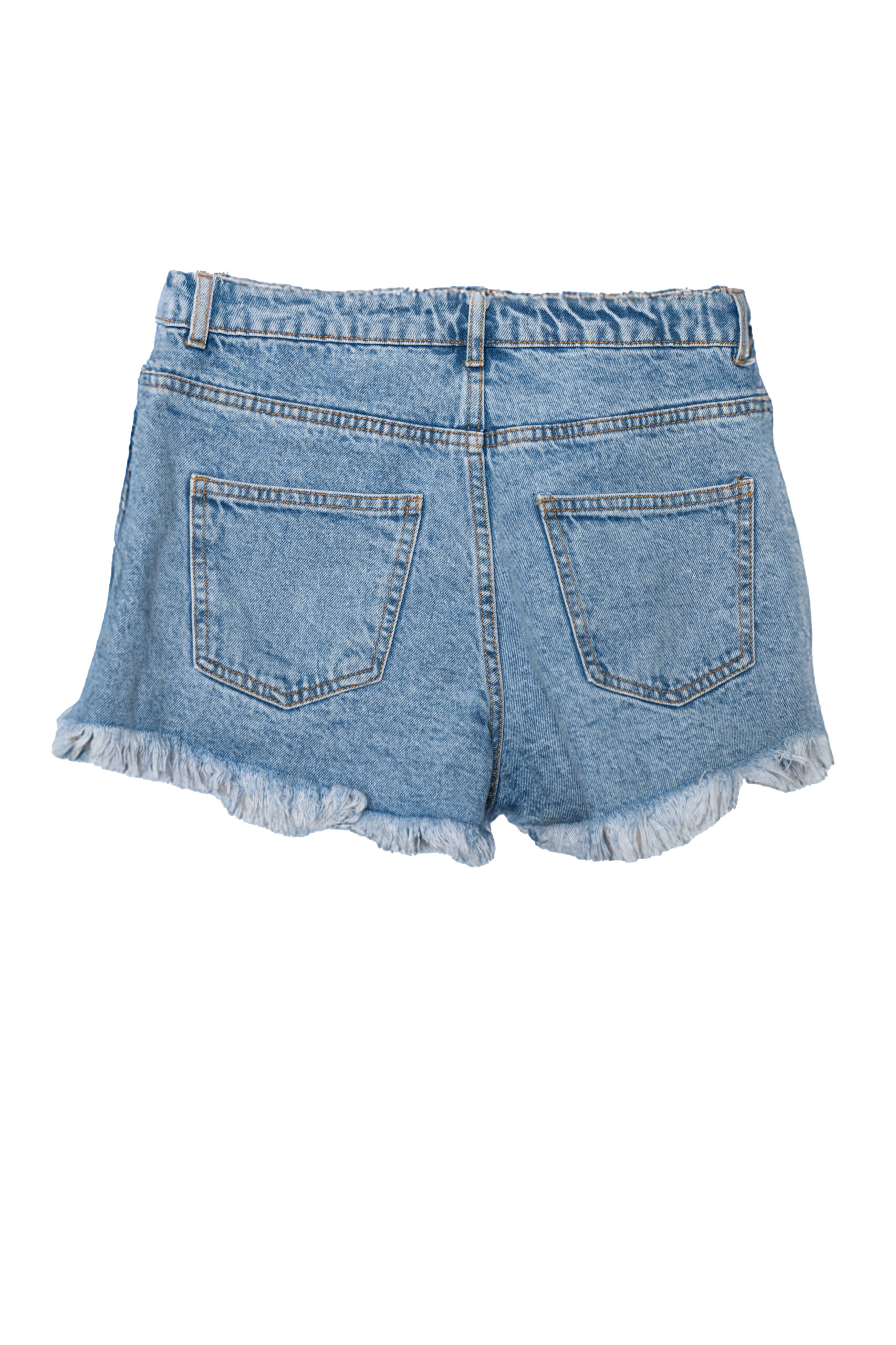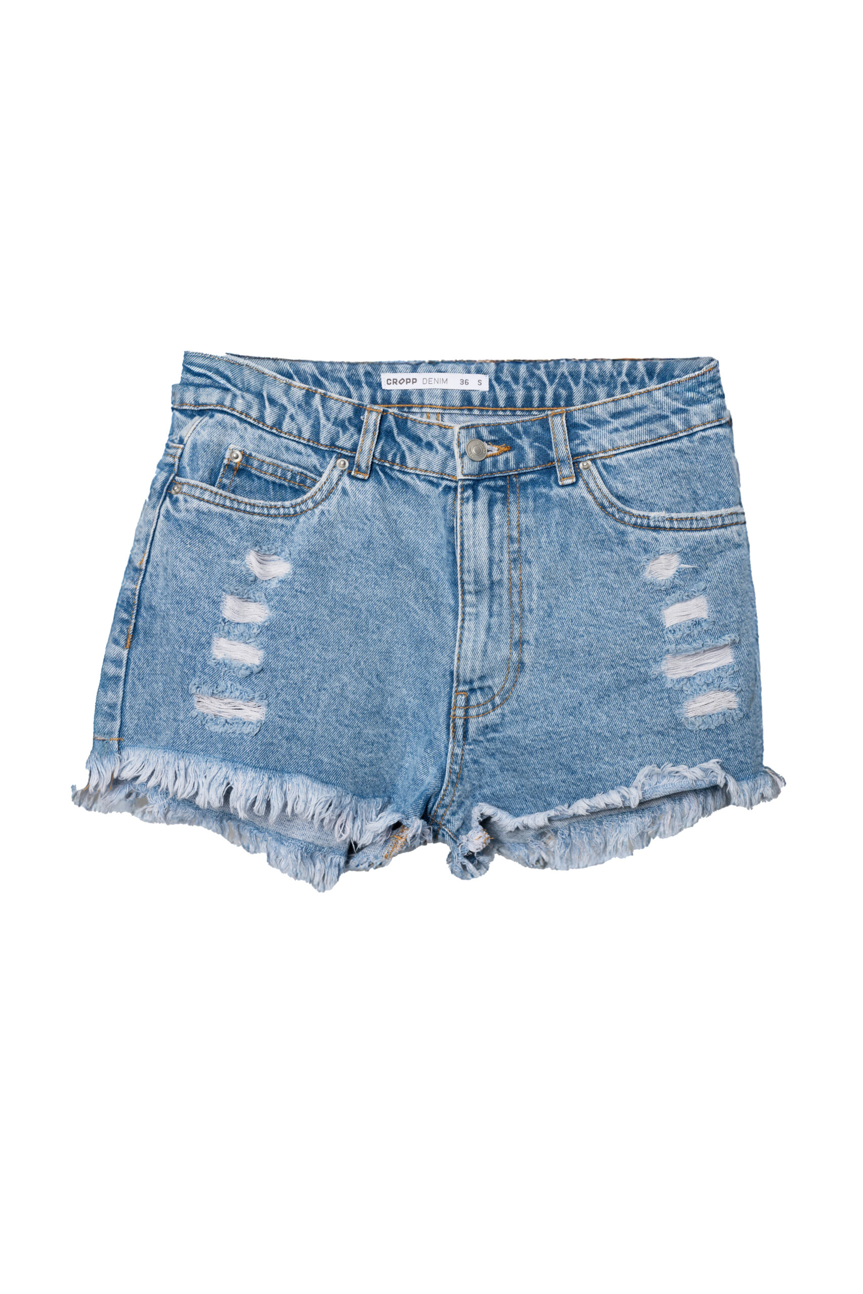 Spodenki z ozdobnymi przetarciami w kolorze niebieskim.