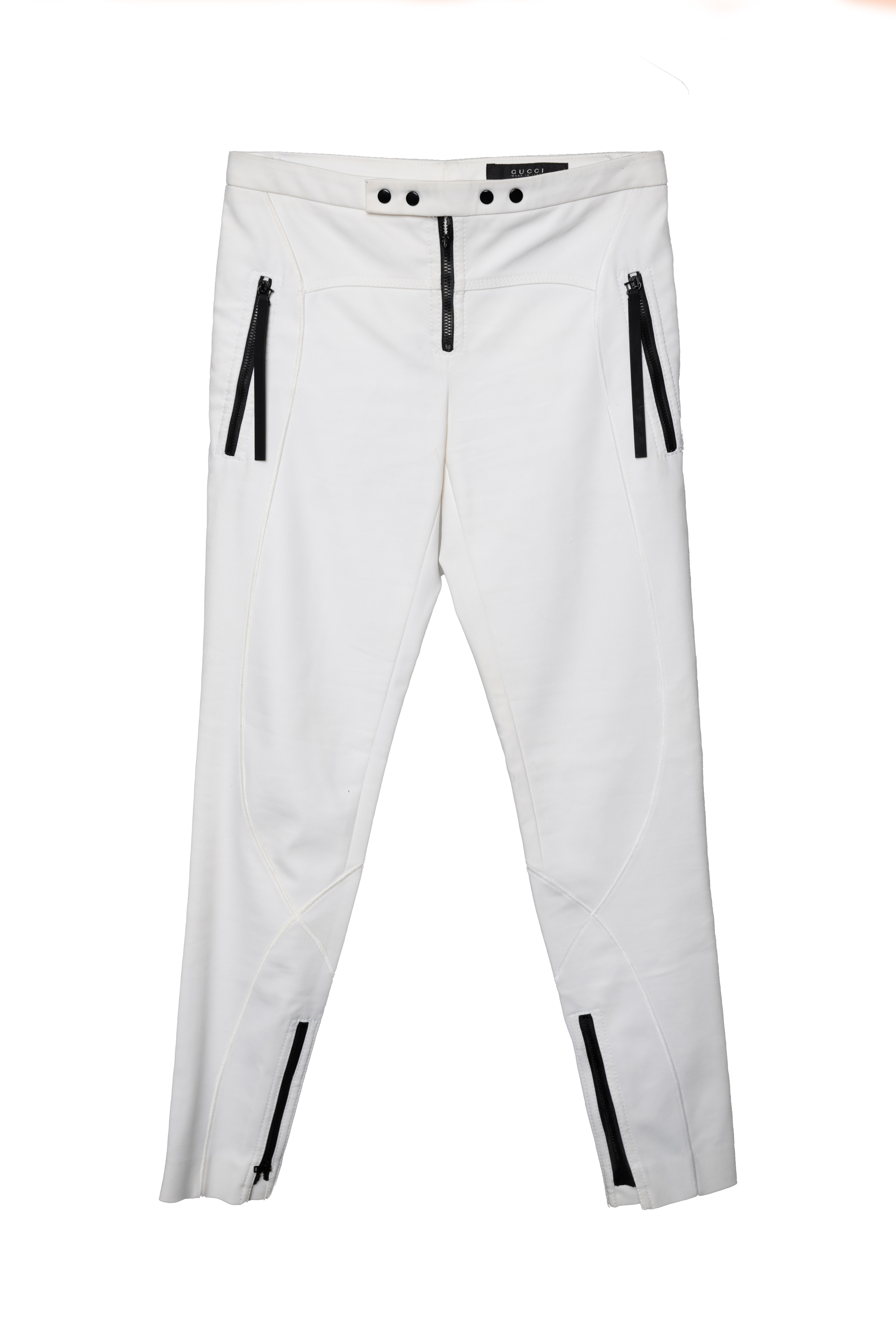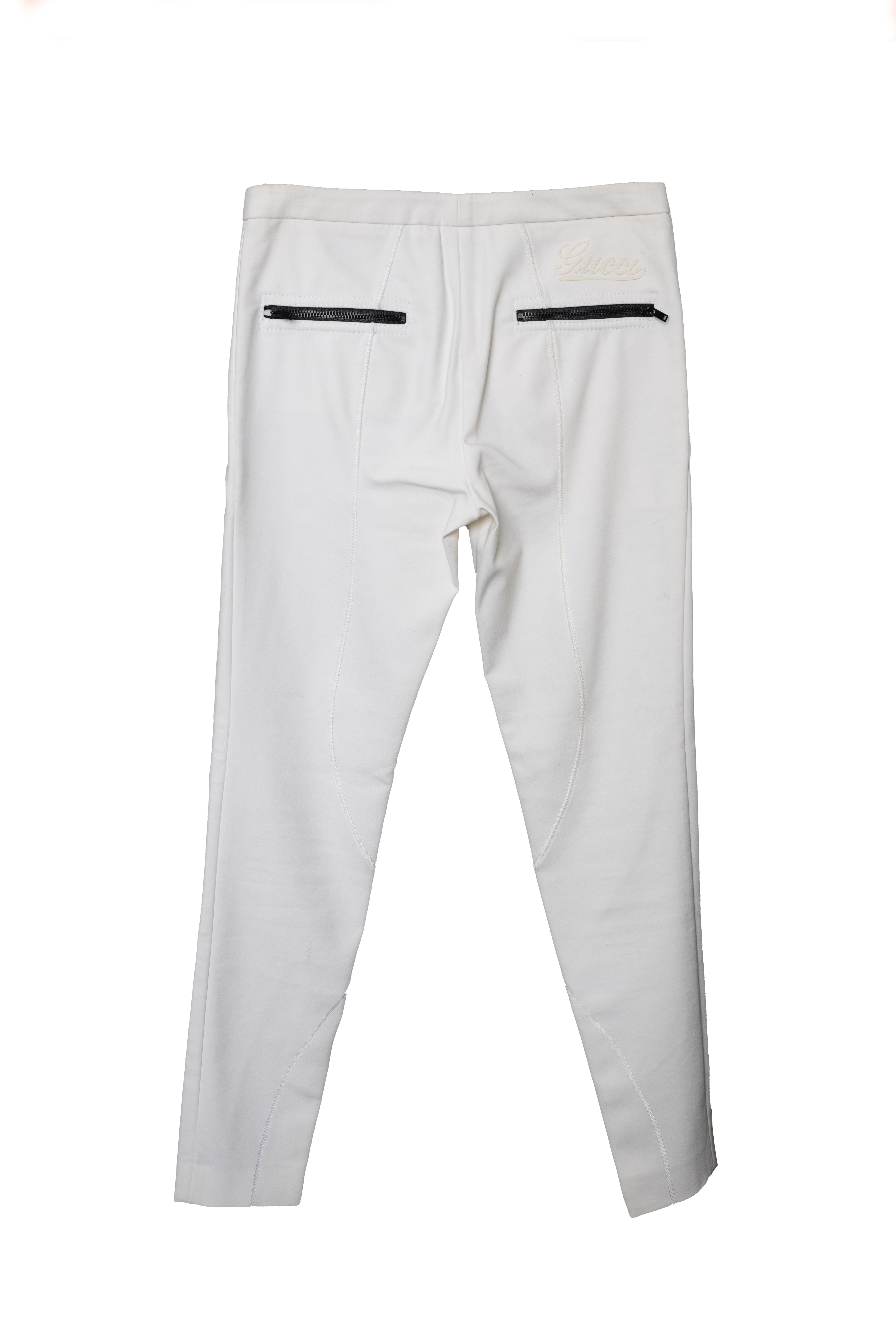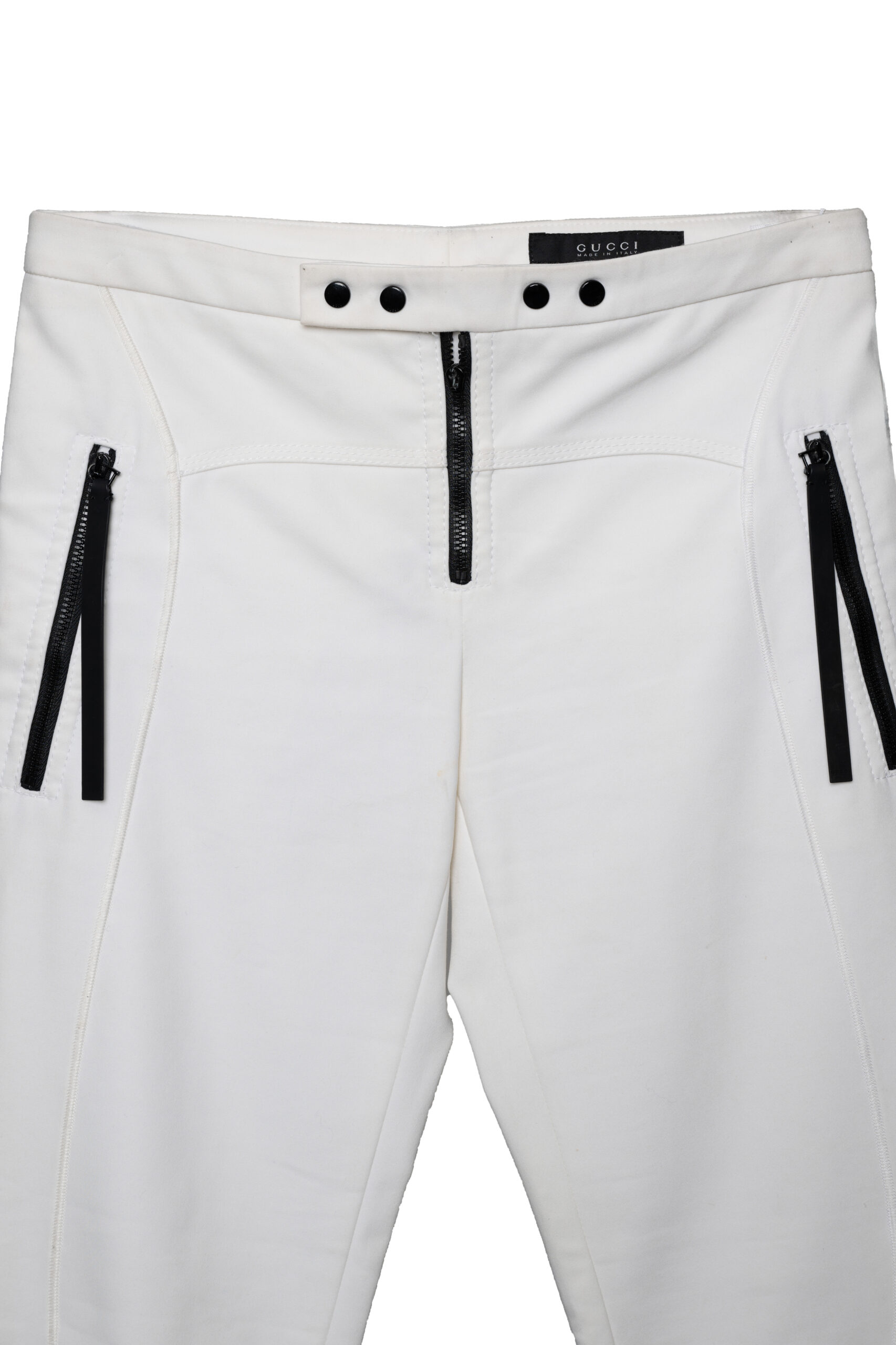 Spodnie o wąskim kroju w kolorze białym z ozdobnymi czarnymi elementami na kieszeniach.