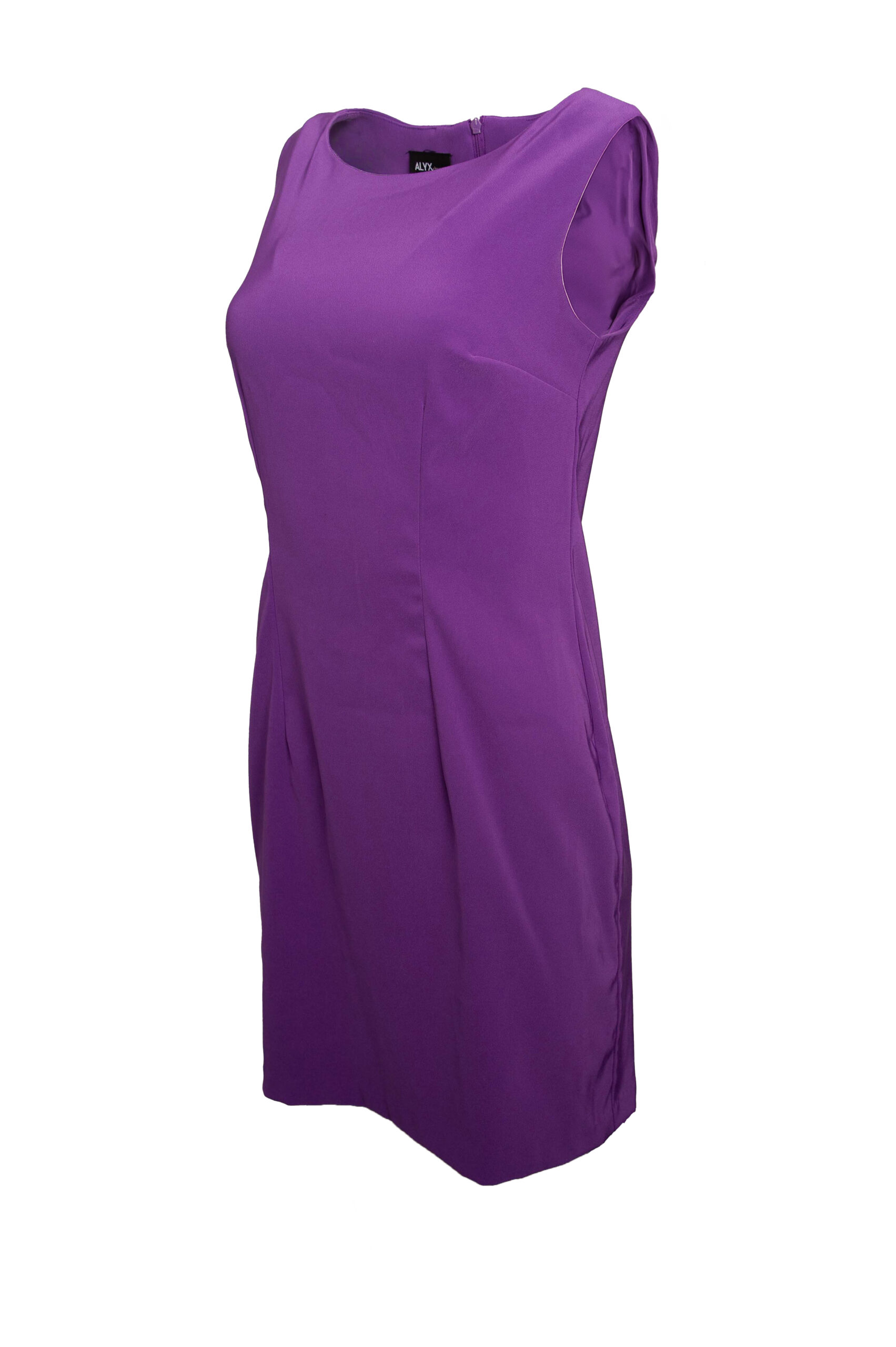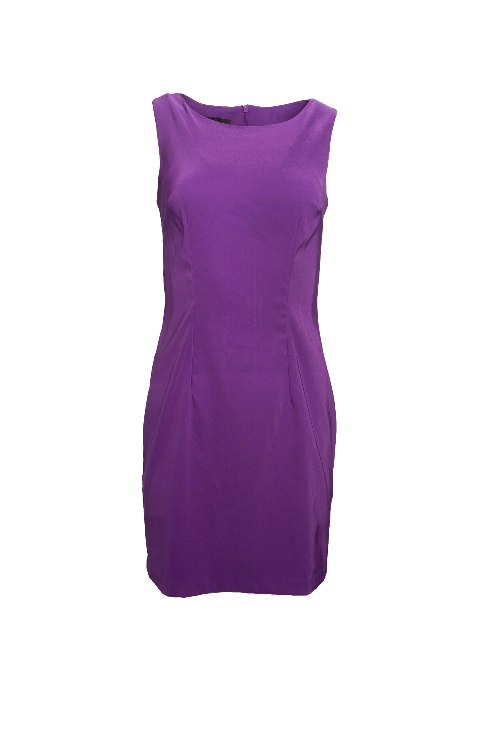 Sukienka bez rękawów taliowana do kolan w kolorze fioletowym.
