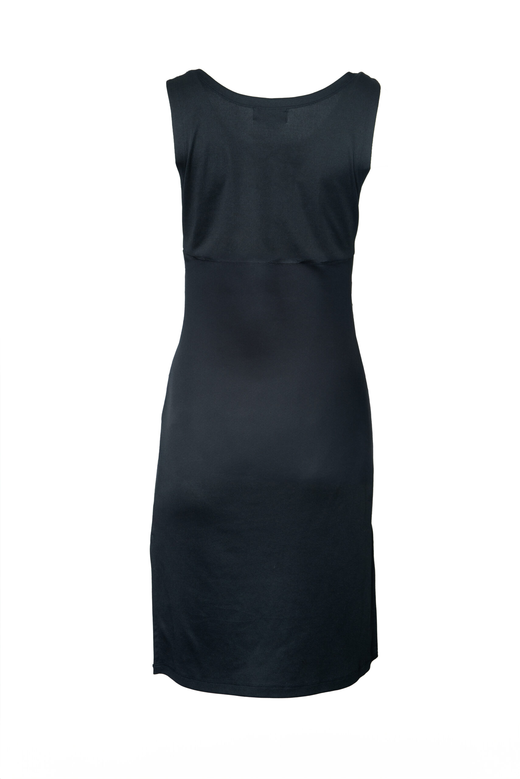 Sukienka mini bez rękawów taliowana w kolorze czarnym.