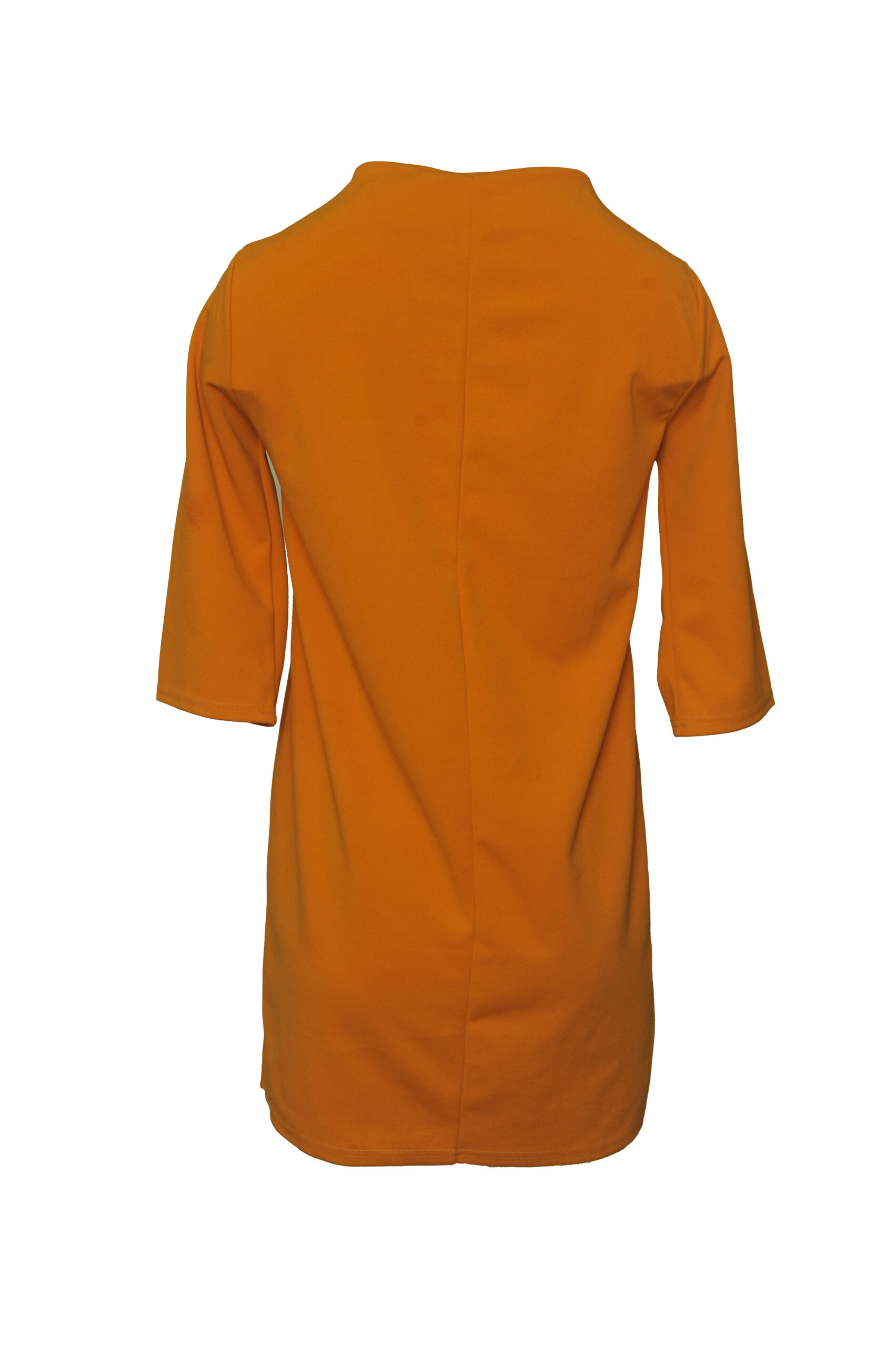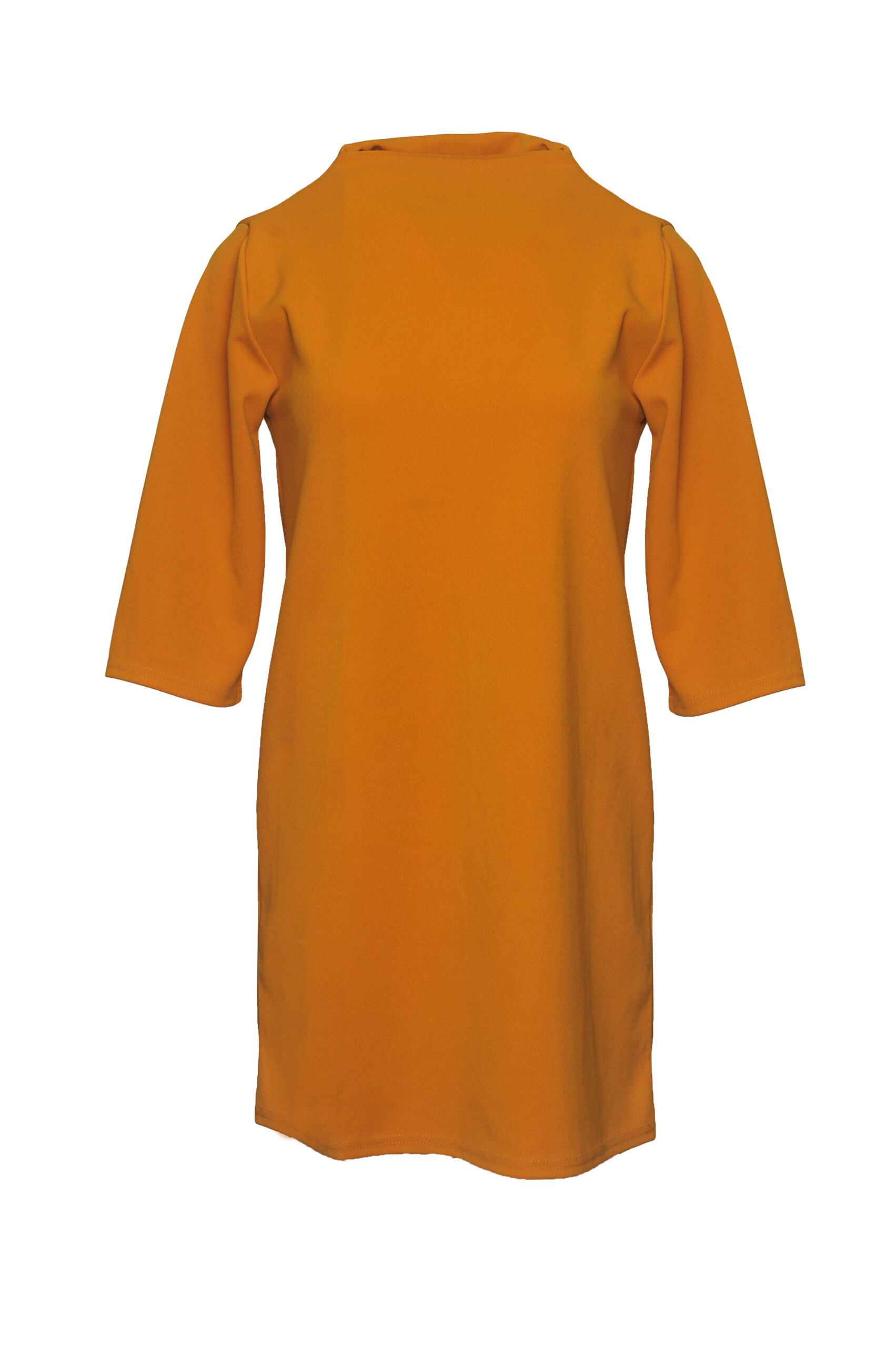 Tunika midi z długim rękawem w kolorze musztardowym.